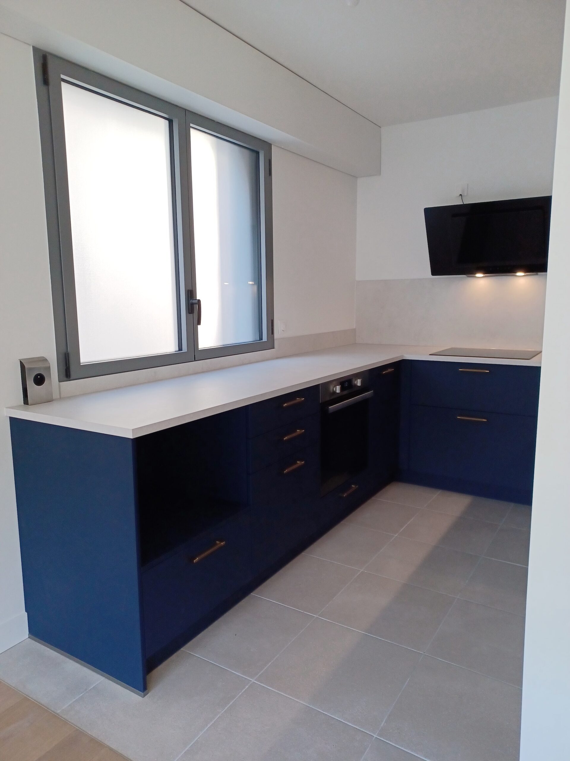 Les façades sont en Fenix Bleu nuit, les plans et crédences sont en stratifié imitation pierre.